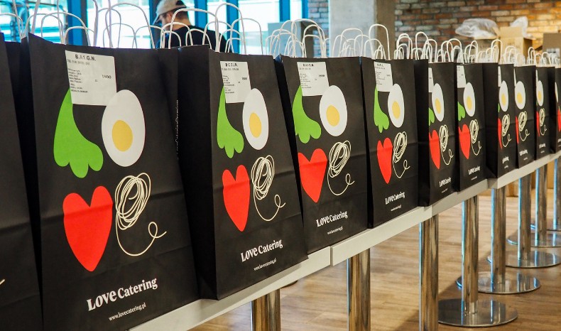 Love Catering stosuje ekologiczne opakowania: tacki XPP (100% do recyklingu), papierowe torby i biodegradowalne sztućce.